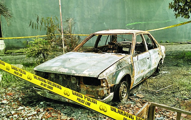 APES: Sebuah Marcedez-Benz hangus terbakar selama api membakar rumah mewah di Darmo Permai Selatan, Surabaya.